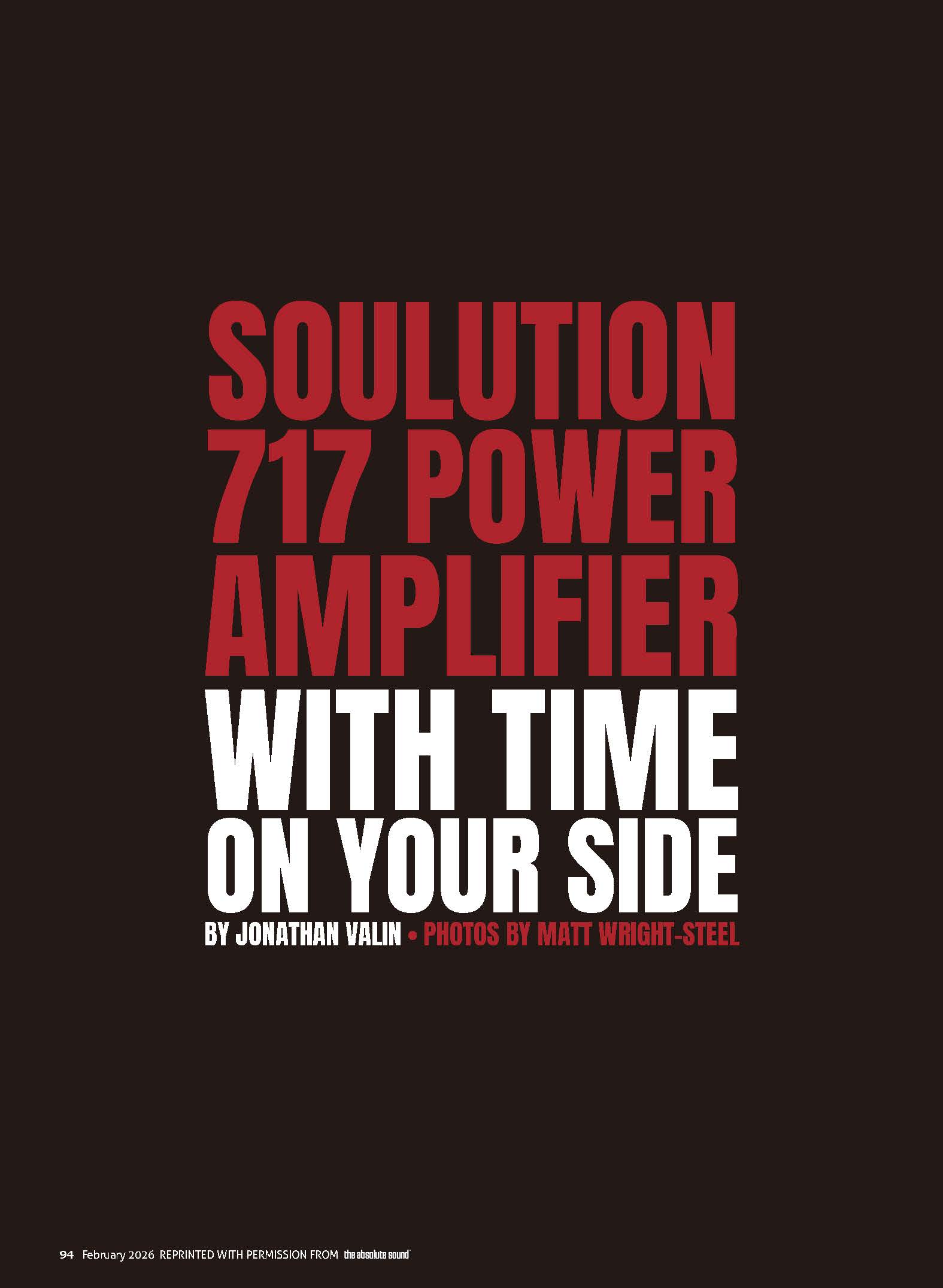《The Absolute Sound》2026年2月刊的評測文章,由 Jonathan Valin 撰寫,評測器材為 Soulution 7 系列最新機種 717 後級擴大機。